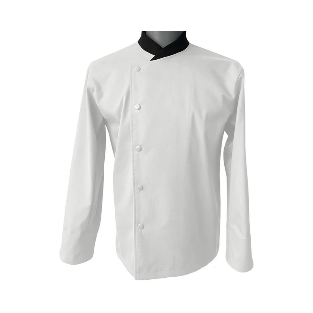 Filipina de chef para caballero. Cómoda gabardina stretch, botonadura de presión cruzada, cuello cárdigan negro, panel de espalda alta en tela seco fit: transpirable, antibacterial, suave y cómoda.