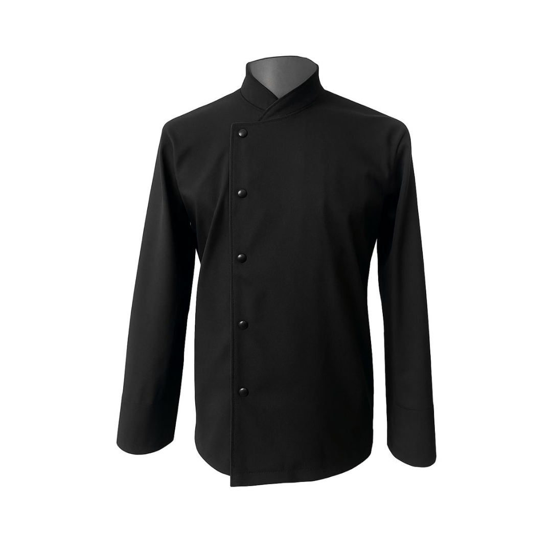 Filipina de chef para caballero. Cómoda gabardina stretch, botonadura de presión cruzada, cuello cárdigan negro, panel de espalda alta en tela seco fit: transpirable, antibacterial, suave y cómoda.