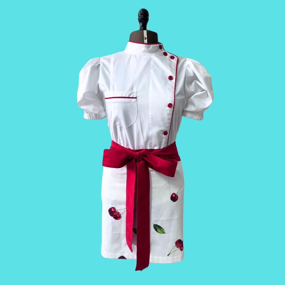 Combinada con mandil corto Rebecca en tela de loneta con estampado de cerezas rojas.