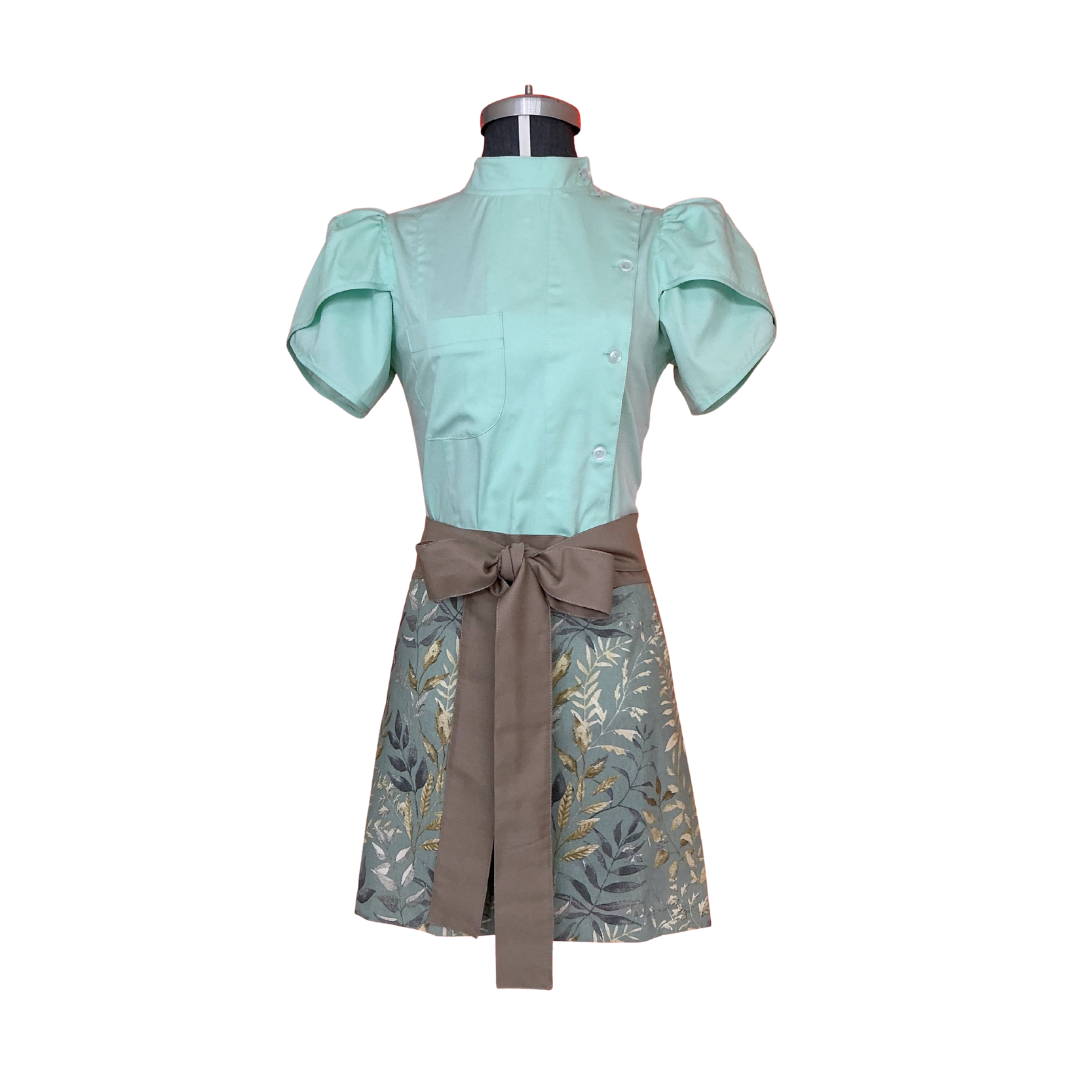 Combinada con mandil corto Rebecca en tela Floral con cintas a juego, creando un conjunto armonioso que aporta elegancia.
